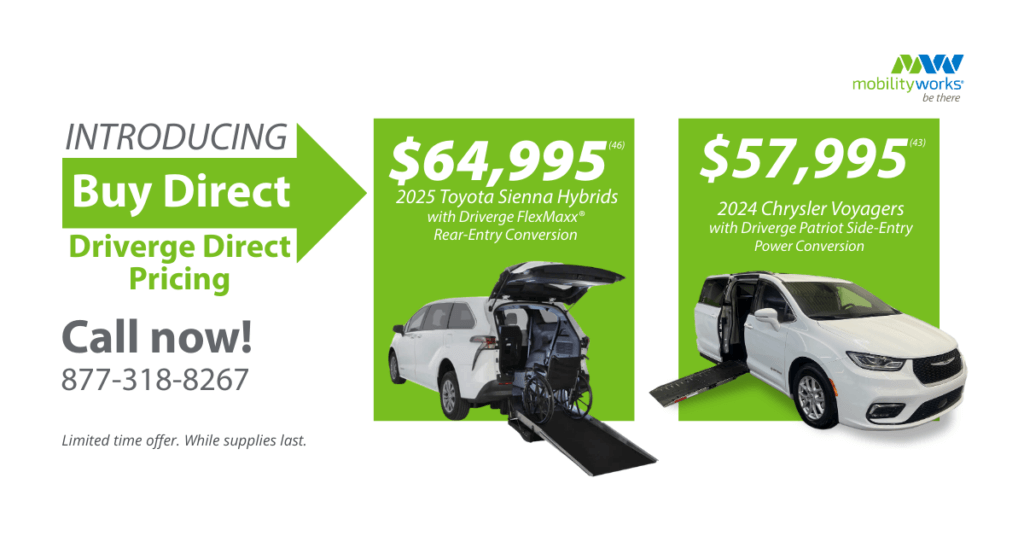 MobilityWorks Buy Direct is offering Driverge Direct pricing on select wheelchair accessible vans available now. These vehicles are built by Driverge Vehicle Innovations and available for immediate purchase while inventory lasts. Current inventory includes the Toyota Sienna Hybrid with Driverge FlexMaxx® rear-entry conversion and the Chrysler Voyager with the Driverge Patriot side-entry conversion. Both vehicles