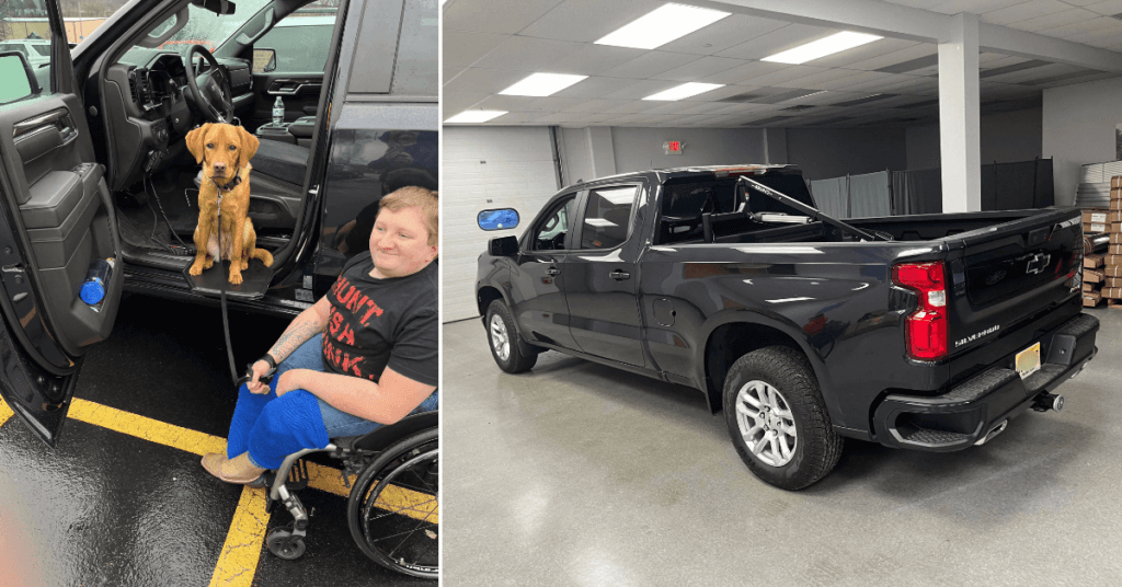 A person in a wheelchair with a dog on a leash sits beside a black pickup truck; the same truck is shown indoors from the rear.
